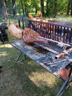 Zwischendurch dann hatten Frank und Tobias das Schwein am Spieß und die Rostbratwürste vom Grill fertig, dazu gab es leckere Salate von unseren Frauen. Alle wurden satt und der Tag konnte bei leiser Radiomusik und leckeren Getränken gemütlich ausklingen.