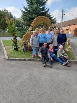 Ein nostalgischer Ackerpflug wurde mit Mais dekoriert. Zahlreiche Sonnenblumen, Zierkürbisse und Hopfengirlanden sowie Strohpuppen schmücken die gewaltigen Strohballen.