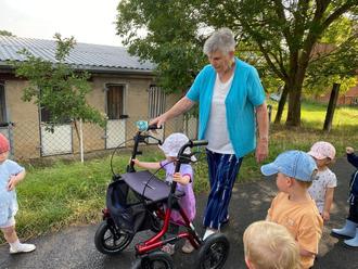 „Tante Anne“ (Frau Drese) freute sich über die ganze Kinderschar und wir kamen schnell ins Gespräch. Sie zeigte und erklärte den Kindern ihren Rollator und was er alles kann. Zur Freude durften die Kinder mit Frau Drese diesen auch hin und herschieben. Im Kindergarten nutzen die „Kleinen Strolche“ ein solches Gerät zum Laufen lernen.