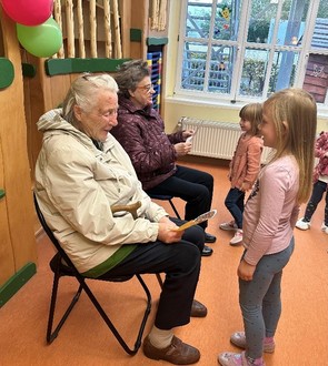 An einem verregneten Vormittag im Oktober haben wir die zwei Geburtstagsgäste der Tagespflege Mertendorf, Oma Hilpert und Oma Kunstmann, in unsere Kita „Kleine Strolche“ in Punkewitz eingeladen.
