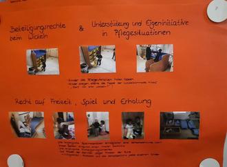 Die jüngeren Kinder der Einrichtungen stellten gemeinsam mit den pädagogischen Fachkräften Plakate her, auf denen die Kinderrechte dargestellt werden. Diese Plakate wurden mit Bildern versehen, auf denen dargestellt ist, wie ihre Rechte in der Einrichtung umgesetzt werden und finden einen sichtbaren Platz in den Einrichtungen finden.