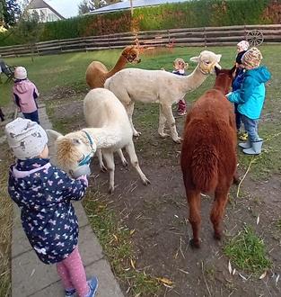 Am Freitag, dem 18. Oktober ging es morgens in unserem Wichtelhaus sehr turbulent zu. Alle Kinder waren aufgeregt, denn es war ein Ausflug zur Alpaka- Farm nach Stößen geplant. Mit dem Linienbus machten wir uns auf den Weg. Das war ja schon ein erstes Abenteuer! In Stößen mussten wir nur ein kurzes Stück laufen, dann waren wir bei den Alpakas. Wir wurden sehr freundlich von Frau Adam begrüßt und auch von den neugierigen Alpakas, welche ihre Hälse über den Zaun streckten. Im Gehege dauerte es nicht lange, da war die Scheu bei den Kindern und auch den Tieren verflogen.