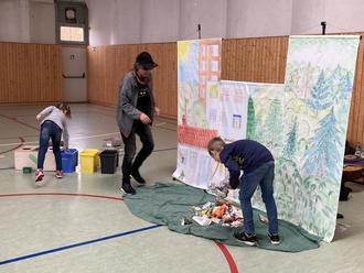 Voller Spannung betraten die Kinder die Turnhalle und waren sofort vom Bühnenbild begeistert. Begrüßt wurden sie von Ricus, der Müll auf dem Spielplatz gefunden hat. Dieser musste natürlich getrennt und entsorgt werden. Nach einem kurzen Spaziergang war plötzlich die Wiese vor dem Spielplatz erneut vermüllt und Reifenspuren waren zu sehen. Ricus und die Schülerinnen und Schüler der Grundschule Osterfeld begaben sich dann auf eine spannende Spurensuche und lernten dabei auch viel über Umweltverschmutzung und Mülltrennung.