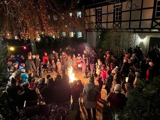 Martin von Tours der – heilige Martin- war Soldat der Reiterei einer Kaiserlichen Garde und trug einen weißen Überwurf (Mantel) den er mit seinem Schwert zweiteilte und eine Hälfte einem Armen übergab, soweit die Überlieferung. Eine Geste der Barmherzigkeit und des Teilens, auch in der heutigen Zeit, die Pfarrer Steffen Springer den Anwesenden am Sankt Martinstag in der Schönburger Kirche in seiner Predigt erklärte. Auch dafür hatten „Kleine Künstler“ unter Leitung von Nicole Fox und Cornelia Kindel eine Episode einstudiert und in der gut gefüllten Kirche vorgetragen. So wie in der Überlieferung erzählt wird, dass der Leichnam des heiligen Martin in einer Lichterprozession mit einem Boot überführt wurde und seitdem das Laternenlaufen typisiert ist, war es so auch in Schönburg. Und so zog der Laternenumzug durch das Neubaugebiet zu seinem Endziel, dem Evangelische Bildungshaus, s. Foto. Viele haben hier geholfen, abgesichert durch die Kameraden der Freiwilligen Feuerwehr und in musikalischer Bekleidung durch die Schönburger Blasmusikanten, wurde dieser Abend zu einem Erlebnis. Eine Feuerschale sorgte für Licht und Wärme, und Kinder teilten mit ihren Eltern die von Bettina Weszka gesponserten Martinshörnchen. Bei einem Kinderpunsch und Glühwein wurden Erinnerungen ausgetauscht und so mit Sicherheit die Dorfgemeinschaft weiterbefördert. Gedankt sei hier dem Gemeindekirchenrat unter dem Vorsitz von Udo Henschler, der Küche des Bildungshauses und den Schönburger Blasmusikanten.