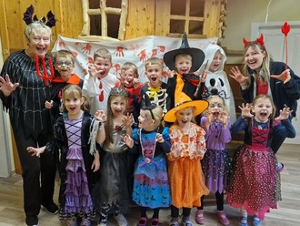 Zu unserer Halloween – Party waren viele kleine Hexen, Spinnen, Vampire, Geister gekommen. Nach dem Frühstück stellten sich alle Kinder auf den „Laufsteg“ vor und ein tolles Gruppenfoto wurde gemacht.