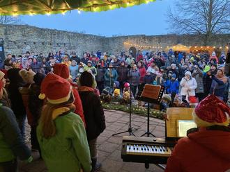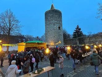 Der Matzturm und der Burghof der Grundschule Osterfeld erstrahlten in festlicher Beleuchtung. Die Hütten der 4 Schulklassen und des Hortes waren weihnachtlich geschmückt und die Freilichtbühne wartete auf seine kleinen Künstler und Sänger.