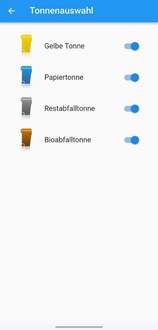 | • | Filtern Sie sich die gewünschten Tonnen. Lassen Sie sich z. B. nur die Blaue und die Biotonne anzeigen. |