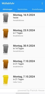 | • | Auf Wunsch werden Sie an Ihre Entsorgungstermine erinnert. Ebenso optional erhalten Sie aktuelle Informationen wie z. B. über einen kurzfristigen Ausfall der Entsorgung in Ihrer Region. |