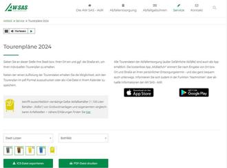 Internetseite www.awsas.de: Auch mit der Nutzung der Tourenpläne auf www.awsas.de erhalten Sie die Entsorgungsdaten schnell und individuell. Folgen Sie hierfür einfach dem Schnellzugriff „Tourenplan“ und wählen Sie zwischen verschiedenen Ausgabemöglichkeiten: Ein kompakte Seite im pdf-Format mit allen Jahresterminen - perfekt zum Aushängen im Hausflur oder an die eigene Pinnwand. Oder Sie laden die Entsorgungstermine als Kalenderdatei (ics-Datei) in den eigenen digitalen Kalender.