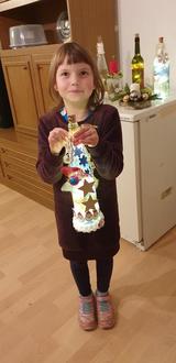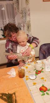 Konnten die größeren Mädchen und Jungen sich alleine der Arbeit widmen brauchten die Kleinen noch Hilfe. Und dafür stand Initiatorin Katrin Hopfe gerne zur Verfügung. So half sie dem zweijährigen Dario, der mit seiner Mama gekommen war, beim Bedrucken einer Flasche mit seiner Handfläche. Linnea zeigte voller Freude und Stolz ihr Selbsgebasteltes, wobei der Papa fleißig mit geholfen hat. So manche Bastelei steht jetzt in den Wohnzimmern der Kleinhelmsdorfer und erfreut alle. Dankeschön für diesen gelungenen Nachmittag.