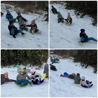 Daraufhin rüsteten wir uns mit unseren Popo- Rutschern und Schlitten aus und flitzen zu unserem Rodelberg auf unserem Kindergartengelände. Wir hatten viel Spaß beim Rodeln und sausten ganz oft den Berg herunter.