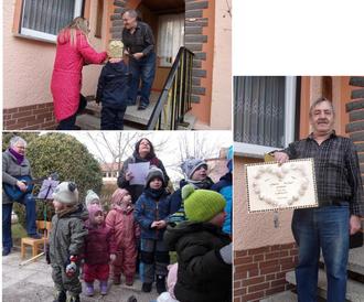 Also haben die Rathewichtel gewerkelt, gebastelt und ein Lied gedichtet. Am 10. Februar überraschten wir das Goldene Paar und bei beiden war die Freude groß. Unser Lied und besonders das leuchtende Herz haben ihnen sehr gefallen. Das war toll!