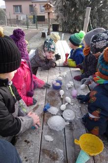 Die Wichtel ließen gefärbtes Wasser in Luftballons und Sandförmchen gefrieren und freuten sich am nächsten Tag über die schönen Eisfiguren. Es gelang uns sogar, Seifenblasen gefrieren zu lassen. Dies war ein beeindruckendes Schauspiel- man konnte dem Frost zusehen, wie er die Seifenblase mit seinem Muster verzierte.