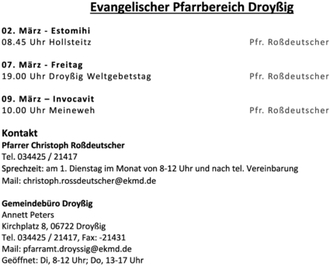 | 19.00 Uhr | Droyßig Weltgebetstag | Pfr. Roßdeutscher |