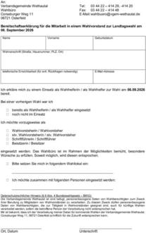 Die Anmeldung sowie weitere Informationen erhalten Sie unter der Telefonnummer 034422/414-29 oder /414-20, per E-Mail unter der Adresse wahlbuero@vgem-wethautal.de oder mit der vorbereiteten Bereitschaftserklärung.