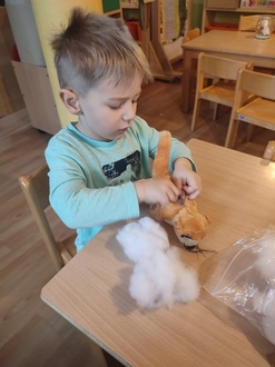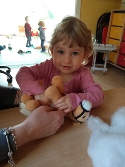 Jeder bekam sein Bastelset und schon begann der Spaß. Die Bären wurden mit Füllwatte gefüllt und jeder konnte entscheiden wieviel in den Bären gestopft wird, damit er richtig kuschlig wird. Danach wurde das Kuscheltier zugenäht und fertig war der neue Freund.