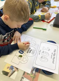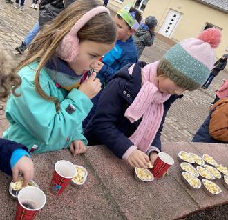 Zum Abschluss bekam jeder ein Stück Kreide und malte 100 Striche, Kreise oder Vierecke auf den Boden. So konnten sich die Schülerinnen und Schüler diese besondere Zahl noch besser vorstellen.