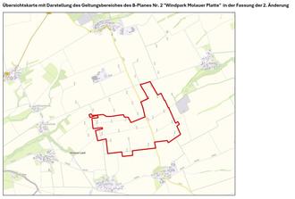 Der Bereich der geplanten Bebauungsplan-Aufhebung erstreckt sich auf den räumlichen Geltungsbereich des Bebauungsplanes Nr. 2 „Windpark Molauer Platte“ in seiner letzten Fassung der 2. Änderung und ist im nachstehenden Kartenausschnitt dargestellt. Der Geltungsbereich hat eine Fläche von ca. 215 ha.