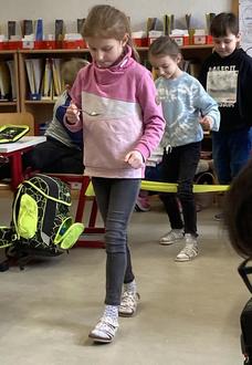 Am Ende gestaltete sie noch ein Spiel für die Löwenklasse, bei dem die Kinder vorsichtig kleine Kügelchen (Kröten) zum Teich bringen mussten.
