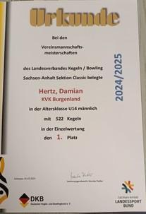 Damian Hertz wurde mit seiner U14-Mannschaft Landesmeister Sachsen-Anhalt und fährt zur Deutschen Meisterschaft nach München. Mit 522 geschobenen Kegeln war er Match-Winner, also Tagesbester und einziger Kegler seiner Altersklasse mit über 500 Holz.