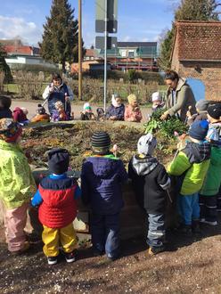 Zusammen mit den Erzieherinnen bereiteten die Kinder einige Girlanden aus Buchsbaum und Kirschlorbeer vor, um damit den Brunnen zu verzieren Der Weg vom Kindergarten bis zum Brunnen wurde mit frühlingshafter Musik untermalt. Als ehemalige Erzieherin der Kita, haben wir Frau Kusch herzlich zu unserem kleinen Osterspektakel eingeladen. Alle stellten sich feierlich im Kreis um den Brunnen und sangen dazu das Lied von Stups dem kleinen Osterhasen. Danach verteilten die Kinder die Sträuße auf dem Brunnen und verzierten ihn noch mit den selbst hergestellten bunten Ostereiern.