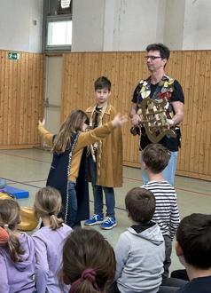 Alle Kinder der Grundschule Osterfeld sitzen gespannt in der Turnhalle. Sie haben rechts und links auf Matten Platz genommen und warten gespannt, was gleich in der Mitte der Turnhalle passiert. Einige Mädchen und Jungen sitzen noch aufgeregter an der Seite, denn sie werden gleich Teil der Opernaufführung „Die Zauberflöte“ sein. Plötzlich sind zwei laute Stimmen zu hören, die sich „warmsingen“. Sandra und Gregor von der Kinderoper Papageno aus Wien betreten die Turnhalle und erfüllen den gesamten Raum mit ihren Stimmen. Sie begrüßen die Kinder und widmen sich dann den Schauspielern des Tages. Während sie eingekleidet werden, erklärt Gregor, was für eine Opernaufführung wichtig ist und bindet das gespannte Kinderpublikum mit ein. Der Dirigent Aaron steht bereit und schon ist der erste Teil der Oper zu hören. Tamino, gespielte von Arthur, muss vor der gefräßigen Schlange flüchten und alle halten den Atem an ...