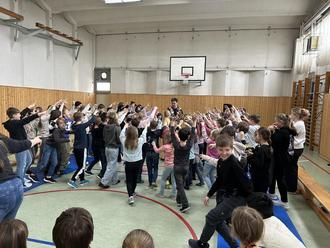 In den nächsten 60 Minuten gibt es einen Wechsel aus Erklärungen zur Oper und dem Opernstück selber. Sandra und Gregor erklären, spielen und singen und werden dabei von Arthur, Sina, Mathilde, Alina, Lena, Nils, David, Leonora und Hannah unterstützt. Sie hatten ihre Rollen wochenlang im Musikunterricht mit Frau Wiegand geprobt. Beim Sklavenchor und am Ende konnte sogar alle Schülerinnen und Schüler der Grundschule mitsingen und tanzen.