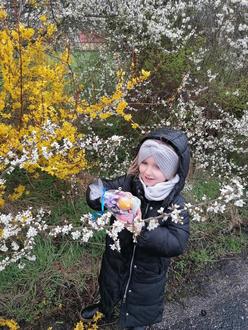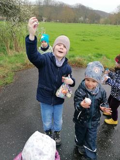Am 31.03.2023 wurden wir schon am frühen Morgen von einem köstlichen Duft im Kindergarten begrüßt. Zum Frühstück gab es leckere selbstgebackene Waffeln, die wir uns schmecken ließen. Nach der Spielzeit hoppelte der Osterhase an unserem Fenster vorbei, auf der Suche nach ihm machten wir uns gleich auf den Weg und schauten, ob er uns etwas dagelassen hat. Leider war das Wetter nicht auf unserer Seite und wir mussten im Regen suchen, das hat uns aber nicht davon abgehalten die Ostereier zu finden.