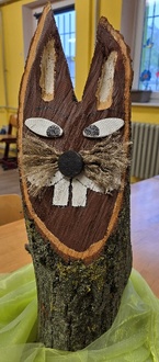 Ein leckerer Duft machte sich dann am Mittwoch im ganzen Haus breit. Am Vormittag wurde Teig geknetet und Plätzchen (Küken, Eier und Hasen) ausgestochen. Diese gab es dann zum Vesper. Hübsche kleine Osterhasen aus Holzstämmen bastelten die Kinder dann am Donnerstag. Mit Pinsel und Farbe wurde gemalt und mit Papier die Ohren gebastelt. Alle Kinder waren stolz auf ihre Häschen und hatten Freude beim Basteln. „Peter Hase“ stand am Freitag auf dem Programm. Der Film strapazierte die Lachmuskeln und alle gingen entspannt ins Wochenende.