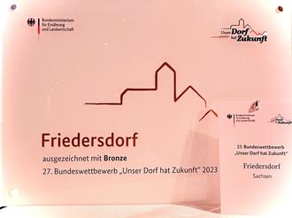 „Die Geschichte im Herzen, die Zukunft im Blick“ - unter diesem Motto ist Friedersdorf in den Wettbewerb "Unser Dorf hat Zukunft" ins Rennen gegangen und hat im Kreiswettbewerb einen 2. Platz errungen, wurde Sieger im Sachsenland und hat im anschließenden Bundeswettbewerb eine Bronzemedaille errungen. Das heißt aber nicht, dass wir nun nichts mehr machen wollen.