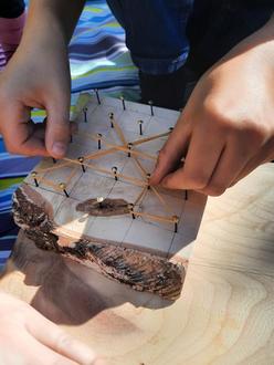Bei herrlichem Sonnenschein machten sich Erst- und Viertklässler wieder einmal auf den Weg in den Wald. Es gab die Aufgabe unterwegs essbare Kräuter zu sammeln. Also starteten wir mit einer kleinen Wildkräuterkunde. Bei einem Pfaffenhütchenstrauch lernten die Kinder die Einteilung der Pflanzenwelt in essbare, ungenießbare und giftige Pflanzen kennen. Daran schloss sich eine kleine Belehrung darüber an, dass unterwegs niemals gesammelte Kräuter, Früchte, Beeren einfach gegessen werden dürfen, sondern wir sammeln, bestimmen und waschen erst alles ab, bevor wir es in der Gemeinschaft genießen. So auch an diesem Tag. Die gesammelten Kräuter waren ein Beitrag für unser gemeinsames, gemütliches Brötchenfrühstück im Waldgarten. Angerichtet auf einem aus einem Birkenstamm gesägten Bord genossen wir zusammen das leckere Frühstück. Daran schloss sich eine Lernzeit in den Fächern Werken und Mathematik an. Wir wiederholten rechte Winkel, die Einheit Zentimeter und lernten den Anschlagswinkel mit Skala als Werkzeug kennen. Dann rissen die Kinder in Zweierteams aus einem Erst- und einem Viertklässler auf vorgesägten, quadratischen Brettchen ein Raster an. Das war nicht ganz einfach. Aber alle schafften es in ihren Teams mit gegenseitiger Hilfe und abwechselnden Aufgaben ihr Raster richtig aufzuzeichnen. Als nächstes folgte der Arbeitsschritt schleifen. Ecken und Kanten der Brettchen mussten mit Schleifpapier glatt geschliffen werden. Der letzte Arbeitsschritt war das Nageln. 25 Nägel mussten an den richtigen Stellen des vorgezeichneten Rasters eingeschlagen werden.