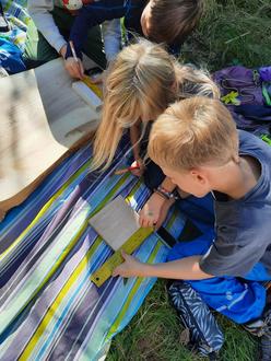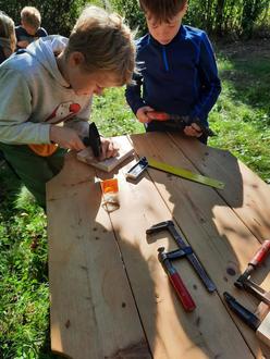 An einem sonnigen Mittwoch im September stellten einige Kinder der SCHKOLA Gersdorf bei ihrem Waldtag Geobretter für den Geometrieunterricht her.