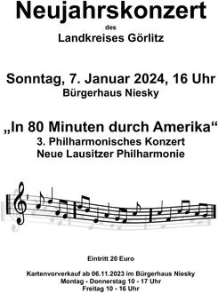 Das traditionelle Neujahrskonzert des Landkreises Görlitz findet am Sonntag, dem 7. Januar 2024, um 16 Uhr im Nieskyer Bürgerhaus statt. Landrat Dr. Stephan Meyer lädt die Bürgerinnen und Bürger des Landkreises herzlich ein, gemeinsam das neue Jahr musikalisch zu begrüßen.