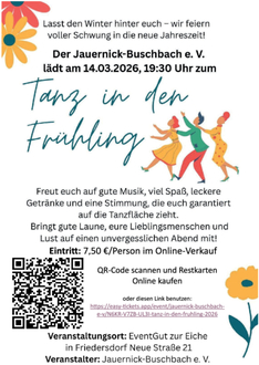 Lasst den Winter hinter euch - wir feiern voller Schwung in die neue Jahreszeit. Unter diesem Motto findet in Friedersdorf im EventGut zur Eiche am 14.03.2026 um 19:30 Uhr der Tanz in den Frühling statt. Es können noch Restkarten über den QR-Code im Flyer bestellt und bezahlt werden.