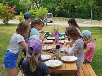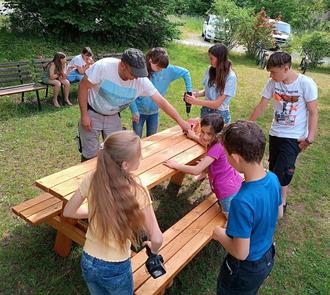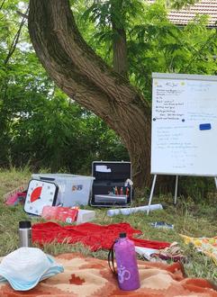 Am 10. Juni wurde der Tisch im Rahmen eines Workshoptages durch den Kinderrat eingeweiht (mit einem Essen natürlich) und danach gemeinsam darüber entschieden, welche Standorte auf der Wiese für diese Sitzmöglichkeit geeignet sind. Zuvor haben die Kinder die vom Bauhof gemulchte Wiese gerecht und die ersten Verschönerungen mit Wimpelketten und selbst gemalten Schildern vorgenommen.