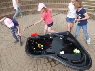 Am 05.06.2024 stieg bei uns eine Party anlässlich des Kindertages. Bei cooler Musik gab es einige Stationen zu bewältigen. Dazu gehörten zum Beispiel Enten angeln, rollendes Zielwerfen, Dreibeinlauf, Kuchen backen um die Wette und Dosenwerfen. Jedes Kind bekam ein Tattoo. Es gab Kinderbowle und leckeres Eis. Als Überraschungsgeschenk warteten für alle Glückswürmchen.