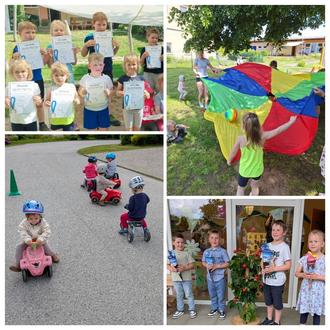 Sportlich wurde es dann am Mittwoch. Bei schönstem Wetter hat unsere Kinder-Quatsch-Olympiade stattgefunden. Die Kinder konnten sich an verschiedenen Disziplinen ausprobieren, unter anderem Gummistiefelweitwurf und Hexenbesenrennen. Für unsere Kleinsten haben wir Schwungtuch und Kriechtunnel ausgepackt. Am Ende des Sportfests gab es für jedes Kind eine Urkunde und ein Eis.