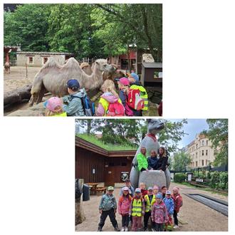 Nur kurze Zeit nach unserer Kinderfestwoche stand für unsere Berggeister das nächste kleine Abenteuer an. Am 11. Juni haben wir Räuber und Zwerge den Tierpark Görlitz besucht. Kurz nach unserem Frühstück haben wir uns um 8 Uhr morgens auf den Weg zur Bushaltestelle in Jauernick gemacht, von wo aus wir nach Görlitz gefahren sind. Nach noch einem kurzen Fußweg haben wir den Tierpark erreicht. Gleich am Eingang wurden wir von den Zwergmangusten begrüßt und unser kleiner Rundgang konnte starten. Nach wenigen Metern bei den Roten Pandas haben wir dann eine kurze Snack-Pause eingelegt, die sich sehr gelohnt hat, denn so hatten wir die Möglichkeit, die eher scheuen Tiere sehen zu können. Später ging es dann noch durch den Bauernhof-Bereich, das Tibet-Dorf und die Vogelanlagen, wo wir überall interessante Tiere gesehen haben, zum Beispiel Schafe und Kühe, Rhesusaffen, die Kamele mit ihrem Jungtier "Malaku", Kängurus, Yaks und die intelligenten Keas. Im Streichelgehege konnten wir Ziegen und Alpakas ganz nah sein und uns an der Arbeit als Tierpfleger ausprobieren, in dem wir zu Schaufel und Rechen gegriffen haben. Auf dem Kletterpfad konnten wir uns später austoben. Mit gut gefüllten Lunchboxen haben wir uns zwischendurch auch eine Mittagspause gegönnt und uns in tierischer Atmosphäre das Essen schmecken lassen. Gegen 13 Uhr war unser Abenteuer dann auch schon wieder vorüber und wir sind zurück in den Kindergarten gefahren. Der Tag im Tierpark hat trotz des eher kühlen Wetters viel Spaß gemacht und wir konnten viel über die heimischen und exotischen Tiere lernen.