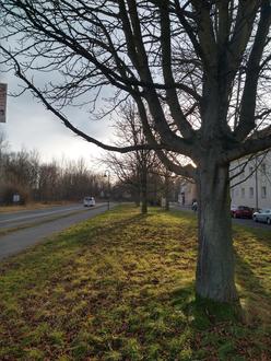 Ortseinwärtiger Blick in die Engelsdorfer Straße und den Mühlweg, denen gegenüber einst ein Übersiedlerheim stand. Nach dessen Abriss in den späten 90er Jahren liegt das Gelände – eines der letzten unbebauten städtischen Flächen – brach. Im Laufe der Zeit entwickelte sich hier (links im Bild) ein Hain. Doch das Gelände rückt allmählich wieder in den Fokus.