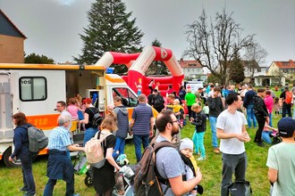 Mit einer großen Aktionsfläche beim Osterfeuer in Mölkau präsentierte sich der DRK Ortsverein und probierte damit ein neues Konzept für die Öffentlichkeitsarbeit aus. Der Focus lag hierbei auf der Einbeziehung der Gäste. Eine Hüpfburg des Roten Kreuzes lockte die jüngeren Besucher und wurde durchgehend rege genutzt. An einem Stand daneben informierten wir über die ehrenamtliche Arbeit des DRK hier vor Ort und luden alle Interessierten ein, an einem Erste-Hilfe-Quiz teilzunehmen. Dieses Angebot wurde großartig angenommen und teilweise rätselten ganze Familien gemeinsam um die richtigen Antworten. Am Abend gab es dann eine Siegerehrung, wo unter den besten Teilnehmern attraktive Preise verlost wurden. Zu den häufigsten Fehlern wurden von den ehrenamtlichen Rettern aus Mölkau-Holzhausen gleich noch die richtigen Handgriffe erläutert und vorgeführt. So konnten die Zuschauer damit ihr Erster-Hilfe-Wissen auffrischen. Darüber hinaus sorgte unser Rettungswagen für reges Interesse bei Groß und Klein. Auch dort konnte man sich fachkundige Erläuterungen abholen und es wurden auch einige kleinere Verletzungen versorgt.