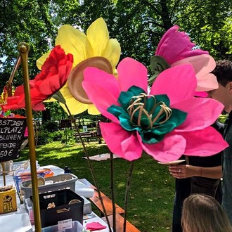 Bereits kurz nach Neun waren die Ersten da und malten Bilder für die OpenAirGalerie, suchten die Kristalle, die überall im Gut hingen und gruben den Sandkasten um, nach den zahlreichen Schätzen dort. Das Fußball-Tennis entpuppte sich zum Sportspaß für Eltern. Das Baum-anmalen war ein kleines Highlight und das Sticken, sowie die Krepppapierblumen von "Kopffüßler" und die Hammerstation sorgten für echte Begeisterung.