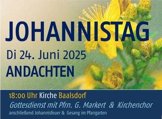 | 24. Juni | 18.00 Uhr | Johannisandacht und Johannisfeuer in Baalsdorf |