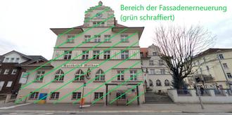 Die Maßnahmen umfassen die denkmalschutzgerechte Sanierung der Hausfront. Untersuchungen ergaben, dass der ursprüngliche Farbton der Fassade blau war, weshalb im Anschluss der Sanierung auch ein neuer Farbanstrich erfolgt.