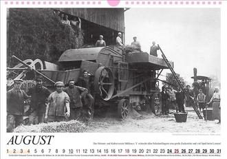 Auf dem Foto aus dieser Zeit ist eine Dampfdreschmaschine zu sehen. Die Leute haben das geerntete Getreide in die Maschine geworfen und es wurde ausgedroschen. Links daneben stand die Strohpresse, die dann die Ballen für die Einlagerung gepresst hat. Angetrieben wurde dieser Maschinenkomplex von einer mobilen Dampfmaschine, wie sie in dieser Zeit üblich war. Das geschah direkt vor der Feldscheune, um Transportwege zu verkürzen.