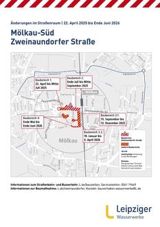 Im Rahmen der grundlegenden Neuordnung der Wasserinfrastruktur im Süden Mölkaus setzen die Leipziger Wasserwerke ihre Leitungsarbeiten seit Mitte Mai bis Ende Juni 2026 im nächsten Bauabschnitt fort: