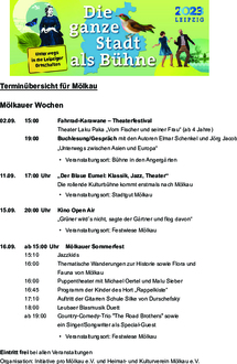Im Rahmen dieser zentralen Veranstaltung im Themenjahr "Die ganze Stadt als Bühne" hat die Ortschaft Mölkau an diesem Nachmittag/Abend verschiedene Veranstaltungen geplant. Bis 15:00 treffen verschiedene Gruppen aus einer Rad-Sternfahrt in Mölkau ein und werden durch den Ortsvorsteher und den Jazzkids begrüßt. Im Anschluss daran beginnen verschiedene Führungen zu historischen Plätzen sowie zu Flora und Fauna in Mölkau (siehe Infos unten). Parallel dazu wird ein Puppentheater mit Michael Oertel und Malu Sieber sowie der Hort "Rappelkiste" der Grundschule Mölkau die Kinder begeistern.