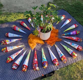 Zurück im Kindergarten wurde der Zuckertütenbaum gesichtet. Die Zuckertüten waren so schwer, dass der kleine Baum sie nicht alle tragen konnte. Eilig stürmten die Kinder herbei, um ihre Zuckertüten in Empfang zu nehmen.