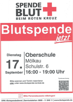 Kommen sie am 17.09. in die Oberschule Mölkau! Jeder Neuspender erhält ein kleines Präsent und natürlich den gewohnt schmackhaften Imbiss unseres Spenderbetreuungsteams!