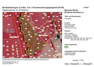 | Gemeine Esche (Fraxinus excelsior L.) | LK Leipzig Gmd. Thallwitz Gmk. Thallwitz Flst. 827, 828, 829, 830, 831, 832, 833, 834, 835, 836, 837, 838, 840 | WT 19 E Abt. 149 a2, a3, a4 |