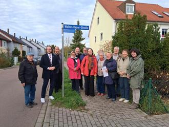 Das neu angebrachte Zusatzschild an der Walter-Bauer-Straße informiert über Leben und Werk des Schriftstellers. Das Anbringen war Teil der Eröffnung des Gedenkjahres.